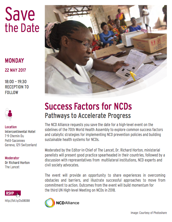 Η NCD Alliance ζητά να σημειώσετε την ημερομηνία για μια εκδήλωση υψηλού επιπέδου στο περιθώριο της 70ης Παγκόσμιας Διάσκεψης Υγείας - Γενικής Συνέλευσης του Π.Ο.Υ. για να διερευνήσουμε κοινούς παράγοντες επιτυχίας και καταλυτικές στρατηγικές για την εφαρμογή πολιτικών πρόληψης των Μη-Μεταδιδόμενων Χρονίων Νοσημάτων (NCDs) και την οικοδόμηση βιώσιμων συστημάτων υγείας για τα μη μεταδιδόμενα νοσήματα.